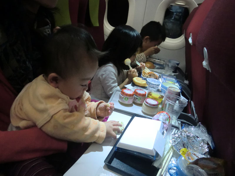 機内食はもちろん離乳食。バシネットは残念ながら設備なし。膝の上に抱えて、いざ香港! さあどんな旅になることやら。
