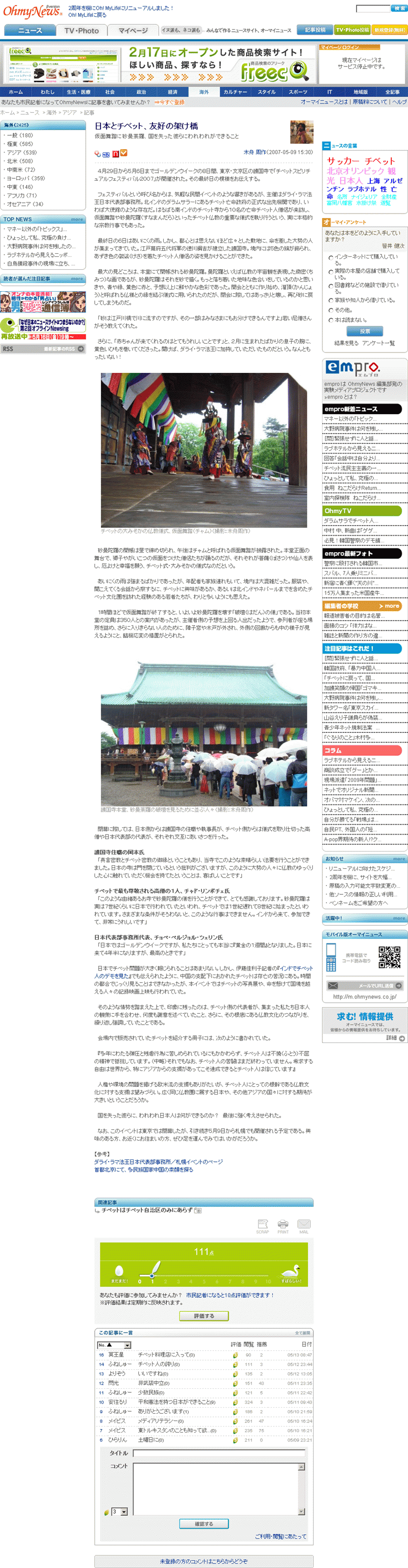 仮面舞踏に砂曼荼羅、国を失った彼らにわれわれができること 4月29日から5月6日までゴールデンウイークの8日間、東京・文京区の護国寺で「チベットスピリチュアルフェスティバル2007」が開催された。その最終日の模様をお伝えする。 フェスティバルという呼び名からは、気軽な民間イベントのような響きがあるが、主催はダライ・ラマ法王日本代表部事務所。北インドのダラムサラーにあるチベット亡命政府の正式な出先機関であり、いわば大使館のような存在だ。はるばる南インドのチベット寺から10名の亡命チベット人僧侶が来訪し、仮面舞踏や砂曼陀羅(すなまんだら)といったチベット仏教の重要な儀式を執り行うという、実に本格的な宗教行事でもあった。 最終日の6日はあいにくの雨。しかし、都心とは思えないほど広々とした敷地に、傘を差した大勢の人が集まってきていた。江戸幕府五代将軍の徳川綱吉が建立した護国寺。境内には5色の旗が飾られ、あずき色の袈裟(けさ)を着たチベット人僧侶の姿を見かけることができた。 最大の見どころは、本堂にて開帳される砂曼陀羅。曼陀羅といえば仏教の宇宙観を表現した緻密(ちみつ)な画であるが、砂曼陀羅はそれを砂で描く。もっと落ち着いた地味な色合いをしているのかと思いきや、青や緑、黄色に赤と、予想以上に鮮やかな色彩であった。開会とともに作り始め、灌頂(かんじょう)と呼ばれる仏様との縁を結ぶ儀式に用いられたのだが、閉会に際してはあっさりと壊し、再び砂に戻してしまうものだ。 「砂は江戸川橋で川に流すのですが、その一部はみなさまにもお分けできるんですよ」若い尼僧さんがそう教えてくれた。 さらに、「赤ちゃんが来てくれるのはとてもうれしいことです」と、2月に生まれたばかりの息子の腕に、黄色いひもを巻いてくださった。聞けば、ダライ・ラマ法王に加持していただいたものだという。なんともったいない! 砂曼陀羅の開帳は昼で締め切られ、午後はチャムと呼ばれる仮面舞踏が披露された。本堂正面の舞台で、獅子やがいこつの仮面をつけた僧侶たちが踊るのだが、それぞれが菩薩(ぼさつ)や仙人を表し、厄よけと幸福を願う、チベット式・大みそかの儀式なのだという。 あいにくの雨は強まるばかりであったが、年配者も家族連れもいて、境内は大混雑だった。服装や、聞こえてくる会話から察するに、チベットに興味があるか、あるいは北インドやネパールまでを含めたチベット文化圏を訪れた経験のある若者たちが、わりと多いようにも思えた。 1時間ほどで仮面舞踏が終了すると、いよいよ砂曼陀羅を壊す「破壇(はだん)の儀」である。当初本堂の定員は350人との案内があったが、主催者側の予想を上回る人出だったようで、参列者が座る場所を詰め、さらに入りきらない人のために、障子窓や木戸が外され、外側の回廊からも中の様子が見えるようにと、臨機応変の措置がとられた。 閉幕に際しては、日本側からは護国寺の住職や執事長が、チベット側からは儀式を取り仕切った高僧や日本代表部の代表が、それぞれ交互にあいさつを行った。 護国寺住職の岡本氏 「真言密教とチベット密教の御縁ということもあり、当寺でこのような素晴らしい法要を行うことができました。日本の寺は門を閉じているという批判がございますが、このように大勢の人々に仏教のゆっくりした心に触れていただく機会を持てたということは、喜ばしいことです」 チベットで最も尊敬される高僧の1人、チャド・リンポチェ氏 「このような由緒あるお寺で砂曼陀羅の儀を行うことができて、とても感謝しております。砂曼陀羅は実は7世紀くらいに日本で行われていたといわれ、チベットでは1世紀遅れて8世紀に始まったといわれています。さまざまな条件がそろわないと、このような行事はできません。インドから来て、参加できて、非常にうれしいです」 日本代表部事務所代表、チョペ・ペルジョル・ツェリン氏 「日本ではゴールデンウイークですが、私たちにとっても本当に『黄金の1週間』となりました。日本に来て4年半になりますが、最高のときです」 日本でチベット問題が大きく報じられることはあまりない。しかし、伊藤佳利子記者の『インドでチベット人のデモを見た』でも伝えられたように、中国の支配下におかれたチベットは存亡の苦況にある。時間の都合でじっくり見ることはできなかったが、本イベントではチベットの写真展や、命を懸けて国境を越える人々の記録映画上映も行われていた。 そのような情勢を踏まえた上で、印象に残ったのは、チベット側の代表者が、集まった私たち日本人の観衆に手を合わせ、何度も謝意を述べていたこと、さらに、その根底にある仏教文化のつながりを、繰り返し強調していたことである。 会場内で販売されていたチベットを紹介する冊子には、次のように書かれていた。 『多年にわたる弾圧と残虐行為に苦しめられているにもかかわらず、チベット人は不撓(ふとう)不