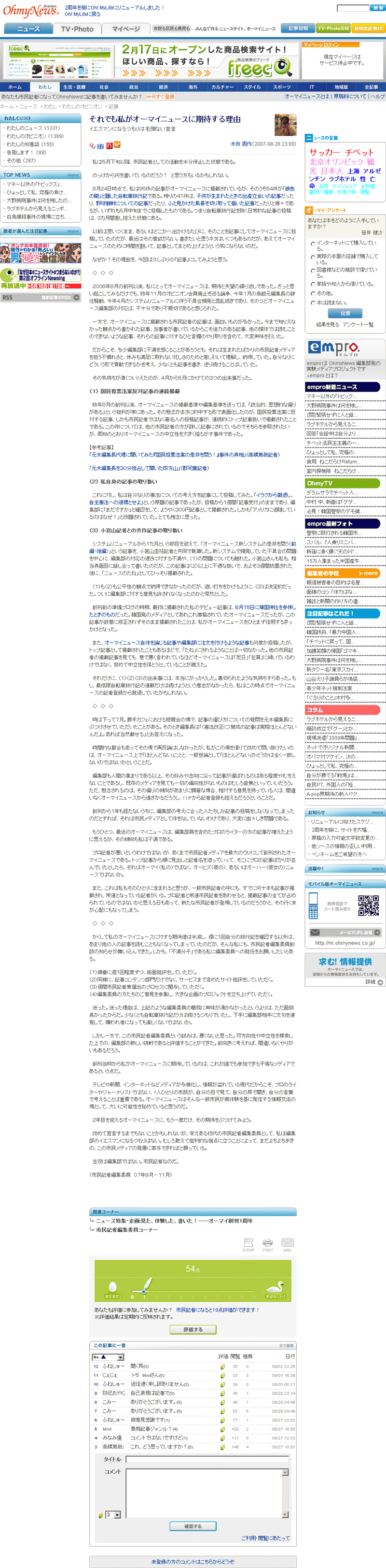 イエスマンになるつもりは毛頭ない宣言 私は5月下旬以降、市民記者としての活動を半分停止した状態である。 のっけから何を書いているのだろう? と思う方もいるかもしれない。 8月24日時点で、私は95件の記事がオーマイニュースに掲載されているが、そのうち54件が「銀色の轍」と題した自転車旅行記である。残りの41件は、子供が生まれたときの出産立会いの記事だったり、野球観戦についての記事だったり、ふと見かけた風景を切り取って描いた記事だったりと様々であるが、いずれも5月中旬までに投稿したものである。つまり自転車旅行記を除く日常的な記事の投稿は、3カ月間差し控えた状態にある。 以前は思いつくまま、あるいはどこかへ出かけるたびに、そのことを記事にしてオーマイニュースに投稿していたのだが、最近はその意欲がない。書きたいと思うネタはいくつもあるのだが、あえてオーマイニュースのために時間を割いて、記事としてまとめ上げようという気にならないのだ。 なぜか?その理由を、今回は久しぶりの「記事」にしてみようと思う。 ◇ ◇ ◇ 2006年8月の創刊以来、私にとってオーマイニュースは、期待と失望の繰り返しであった。ざっと思い起こしてみるだけでも、昨年11月のオピニオン会員廃止を巡る論争、今年1月の鳥越元編集長の辞任騒動、今年4月のシステムリニューアルに伴う不具合頻発と混乱続きであり、そのつどオーマイニュース編集部の対応は、不十分であり不親切であると感じられた。 一方で、オーマイニュースに掲載される市民記者の記事は、面白いものが多かった。今まで知りえなかった観点から書かれた記事、当事者が書いているからこそ迫力のある記事、他の媒体では読むことのできないような記事、それらの記事に対するひと言欄のやり取りを含めて、大変興味を引いた。 だからこそ、多少編集部に不満を感じることがあろうとも、それは生まれたばかりの市民記者メディアを担う不慣れさと、休みも満足に取れない忙しさのためと差し引いて理解し、納得していた。自分なりにどういう形で貢献できるかを考え、少なくとも記事を書き、送り続けることはしていた。 その気持ちが潰(つい)えたのが、4月から5月にかけての3つの出来事だった。 (1) 国民投票法案反対記事の連続掲載 昨年8月の創刊以来、オーマイニュースの掲載基準や編集基準を巡っては、「政治的、思想的な偏りがある」という批判が常にあった。その懸念がまさに的中する形で表面化したのが、国民投票法案に反対する記事、しかも市民記者ではなく著名人の投稿記事が、連続的にトップ記事扱いで掲載されたことである。この件については、他の市民記者の方が詳しく記事にされているのでそちらを参照されたいが、周知のとおりオーマイニュースの中立性を大きく揺るがす事件であった。 【参考記事】 「元木編集長代理に聞いてみた『国民投票法案の是非を問う!』事件の真相」(高橋篤哉記者) 「元木編集長を30分独占して聞いた四方山」(郡司薫記者) (2) 私自身の記事の取り扱い これに対し、私は自分なりの憲法についての考え方を記事にして投稿してみた。「イラクから撤退し、自主憲法への道標とせよ」という原題の記事であったが、投稿から1週間「記事受付」のままであり、編集部に「まだですか」と確認をして、ようやく300円記事として掲載された。しかも「アメリカに追随しているのはなぜ?」と改題されていた。とても残念に思った。 (3) 小宮山記者との共作記事の取り扱い システムリニューアルから1カ月という節目を迎えて、「オーマイニュース新システムの是非を問う(前編・後編)」という記事を、小宮山圭祐記者と共同で執筆した。新システムで頻発していた不具合の問題を中心に、編集部の対応の遅さに対する不満や、(1)の問題についても触れた。小宮山さんも私も、相当真面目に話し合って書いたのだが、この記事は(2)以上に不遇な扱いで、およそ3週間放置された後に、「ニュースのたね」としてひっそり掲載された。 (1)も(2)も公平性の観点で納得できなかったのだが、追い打ちをかけるように、(3)は決定的だった。ついに編集部に対する意見も許されなくなったのかと愕然とした。 創刊前の準備ブログの時期、最初に掲載された私のデビュー記事は、8月15日に靖国神社を参拝したときのものだった。韓国発のメディアとしてあれこれ揶揄されていたオーマイニュースだったが、この記事が故意に修正されずそのまま掲載されたことは、私がオーマイニュースをひとまず信用するきっかけとなった。 また、オーマイニュース自体を論じる記事や編集部に注文を付けるような記事も何度か投稿したが、トップ記事として掲載されたこともあるほどで、「たね」にされるようなことは一切なかった。他の市民記者の掲載記事を見ても、巷で悪く言われているほどオーマイニュースは「反日」「左翼」に傾いているわけではなく、努めて中立性を保とうとしていることが窺えた