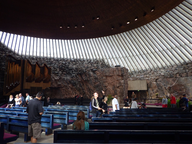 続いてテンペリアウキオ教会。こちらは岩山をくりぬいて造られており、地下基地のようにも宇宙船のようにも見える。裏手から岩山に登ることもできるが、周囲はビルが立ち並んでいて、なんとも奇妙な景観である。