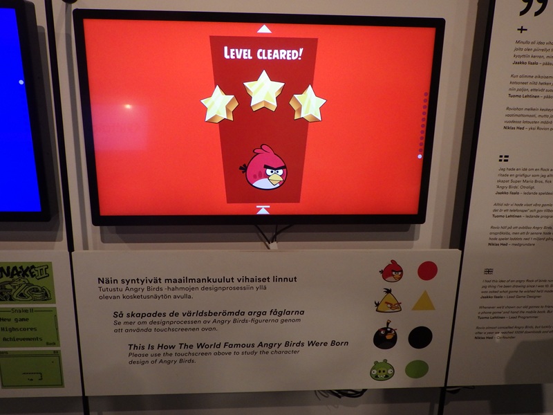 それ以上にみんなが盛り上がったのはゲームデザインについての展示、アングリーバードの登場だった。アングリーバードは日本での知名度は高くないが、世界的に人気の高いスマホゲーム、我が家では航空機の機内ゲームでお馴染みだった。しかしフィンランド発のゲームであることを知らなかった。