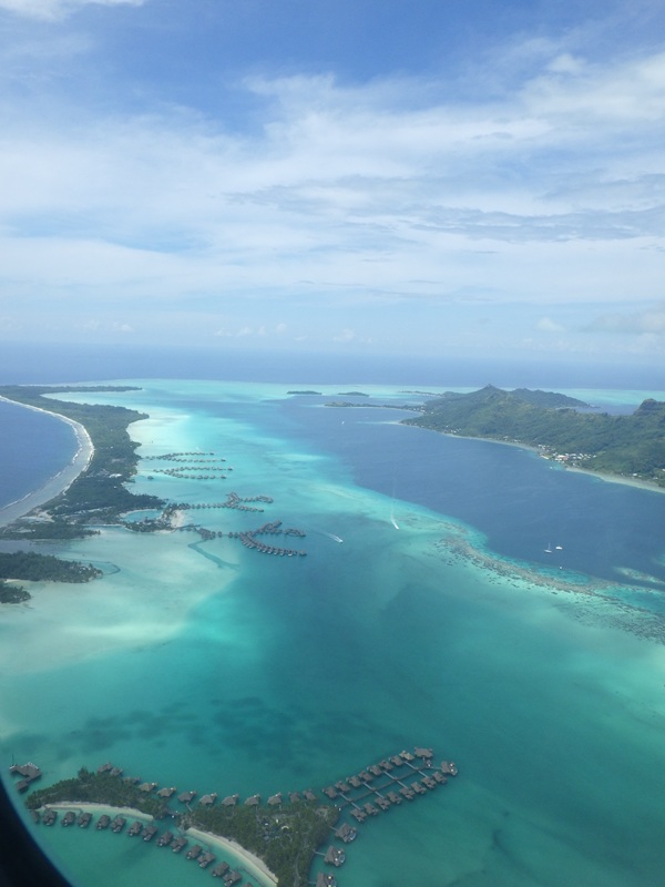 50分ほどのフライトでボラボラ島へ。空からでもひと目でわかる海の透明度、青と緑のコントラストが鮮やかだ。ラグーンに浮かぶリゾートの水上バンガローも一望でき、テンションが上がる。