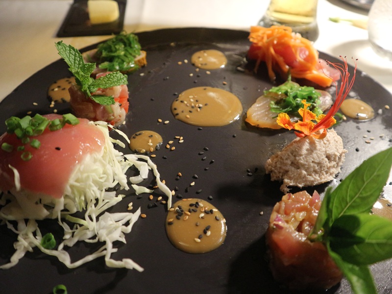そして夕食。日本と同じ島国であるタヒチはシーフードが美味しい。マグロの刺身に醤油ではなく、ココナッツベースのソースと野菜を和えて食するのがタヒチ流。これが前菜なのでけっこう豪華だ。