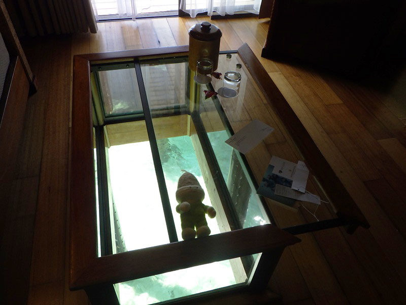 インターコンチネンタル・モアナリゾートのガラステーブルはなんとスライド式、真下で泳ぐ魚たちを観察することもできる。うっかり物を落としてしまわないことに注意だ。