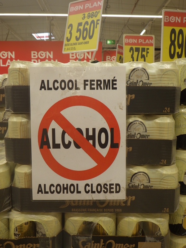フランス系の大型スーパー、カルフールでお土産探し。定番のチョコレートやクッキーのほか、名産のハチミツ、バニラ、モノイオイルなど。日曜の午後はアルコールの販売が禁止されていることに注意だ。