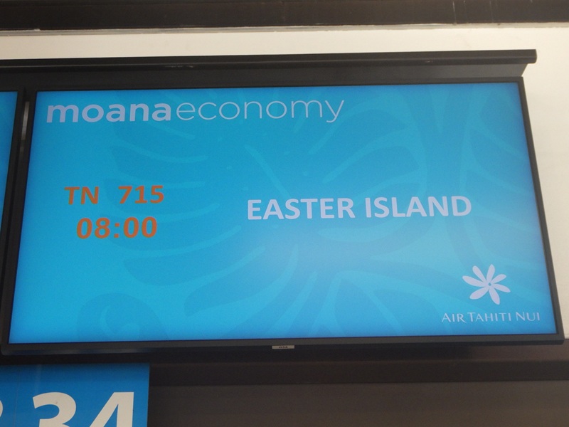 パペーテの空港。案内表示を見ていると、成田行きと並んでなんと「EASTER ISLAND」の表記を見つける。モアイ像のあるイースター島である!